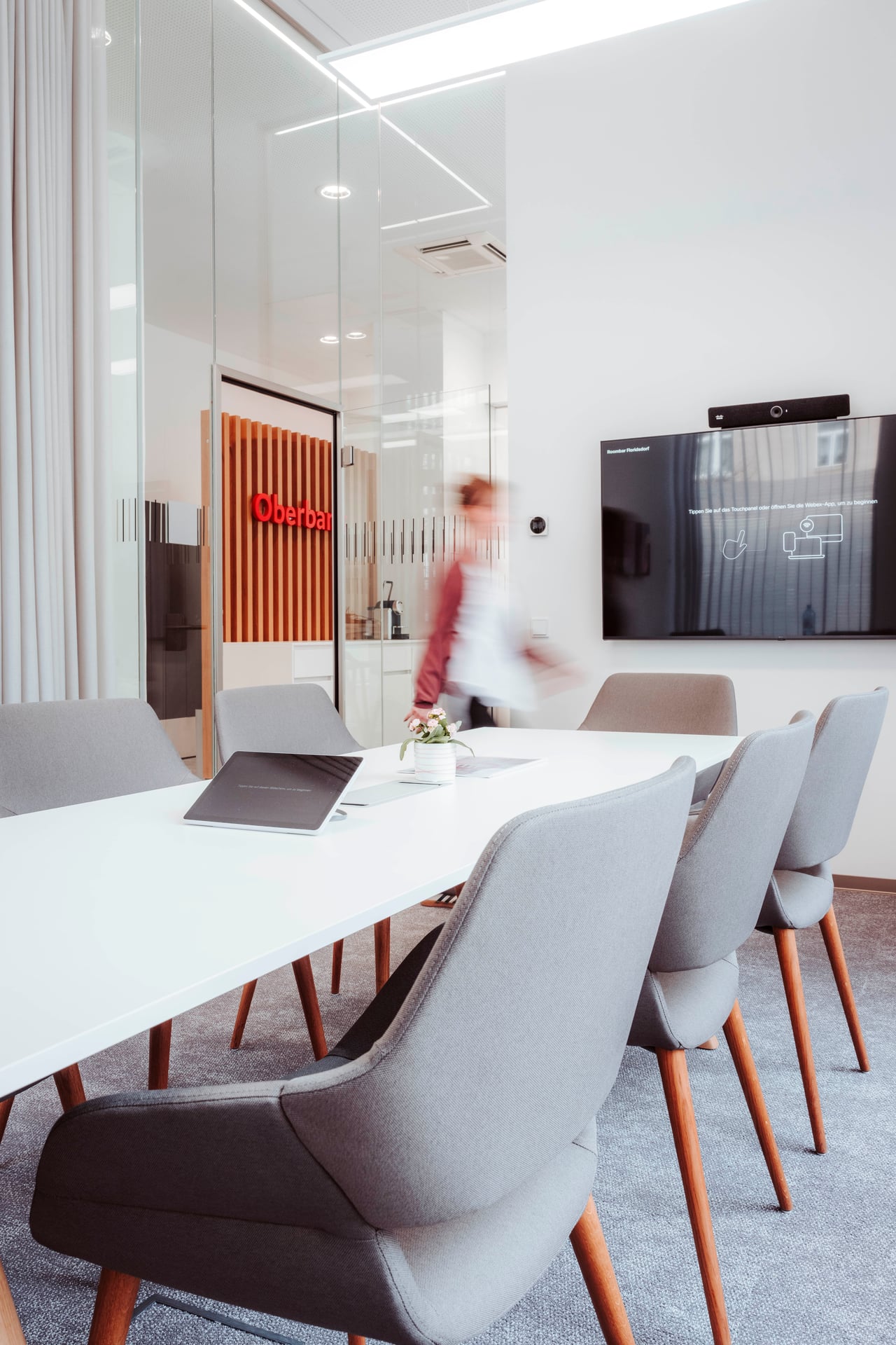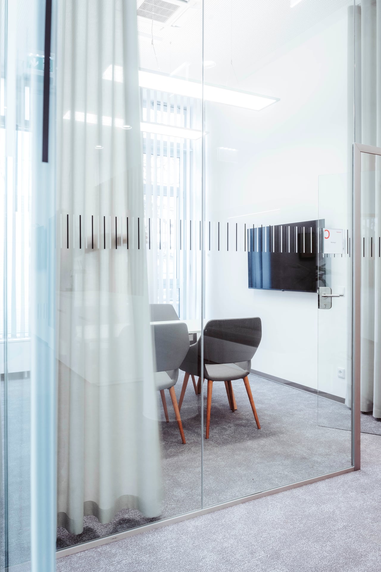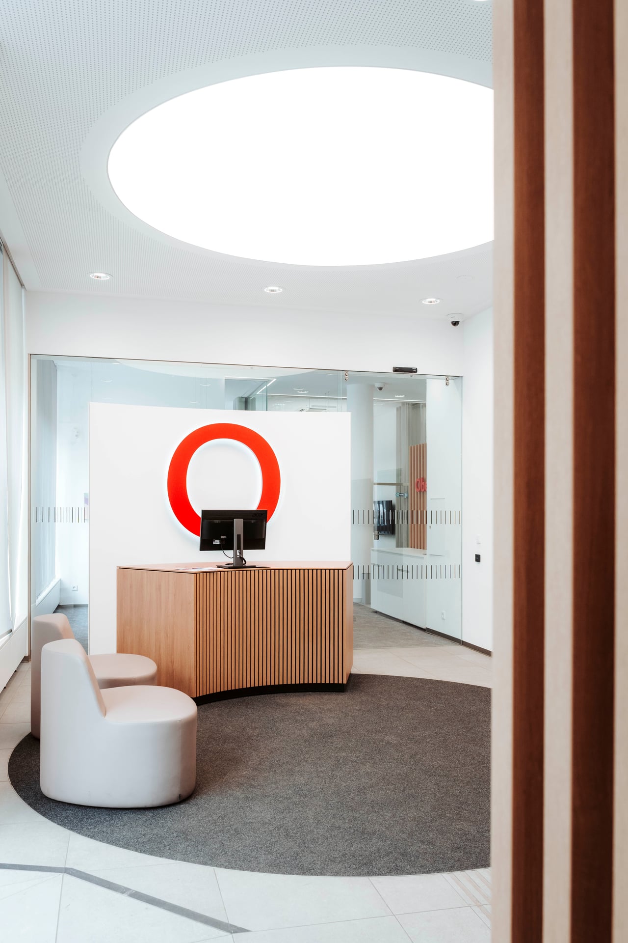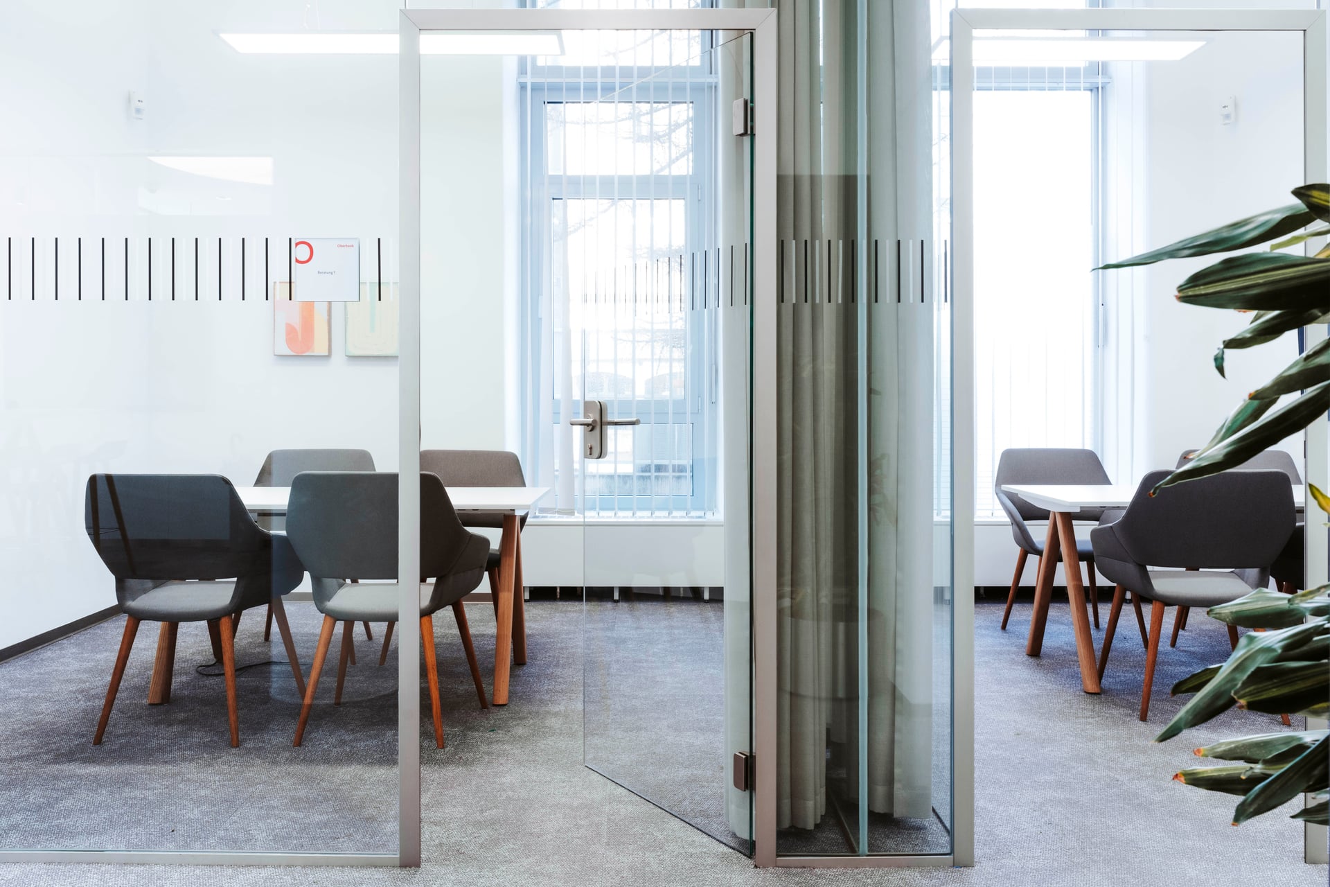 Das Raumkonzept setzt auf eine klare Struktur: Neben den klassischen Servicebereichen bietet eine Kommunikationszone Raum für kurze Gespräche, Wartebereiche oder kleine Veranstaltungen. Die neuen Beratungsräume sind mit großformatigen Bildschirmen ausgestattet. Vorhänge an den Glaswänden schaffen dabei eine wohnliche Atmosphäre und sorgen gleichzeitig für Schallschutz sowie die notwendige Diskretion in den Beratungsbereichen.