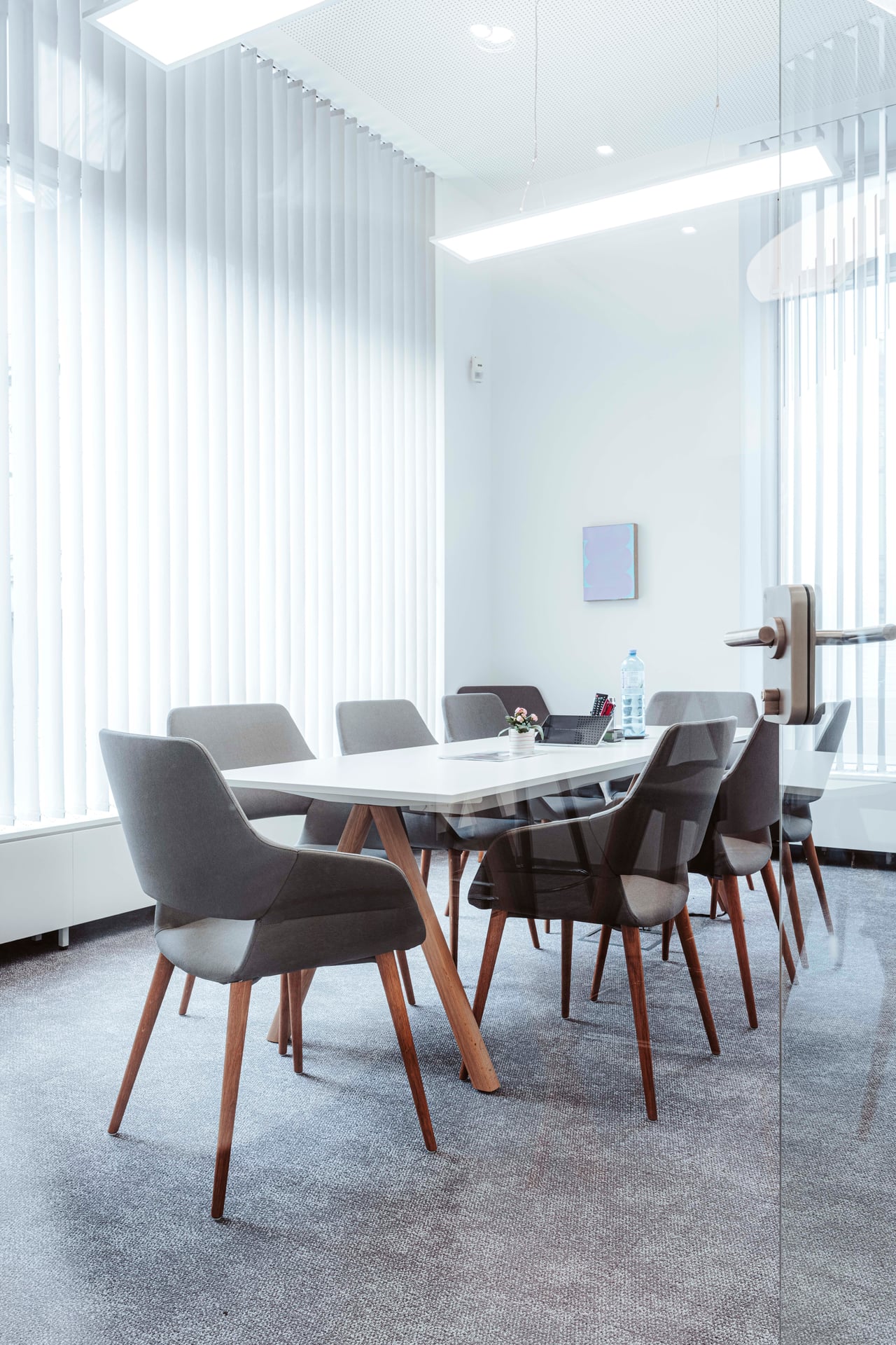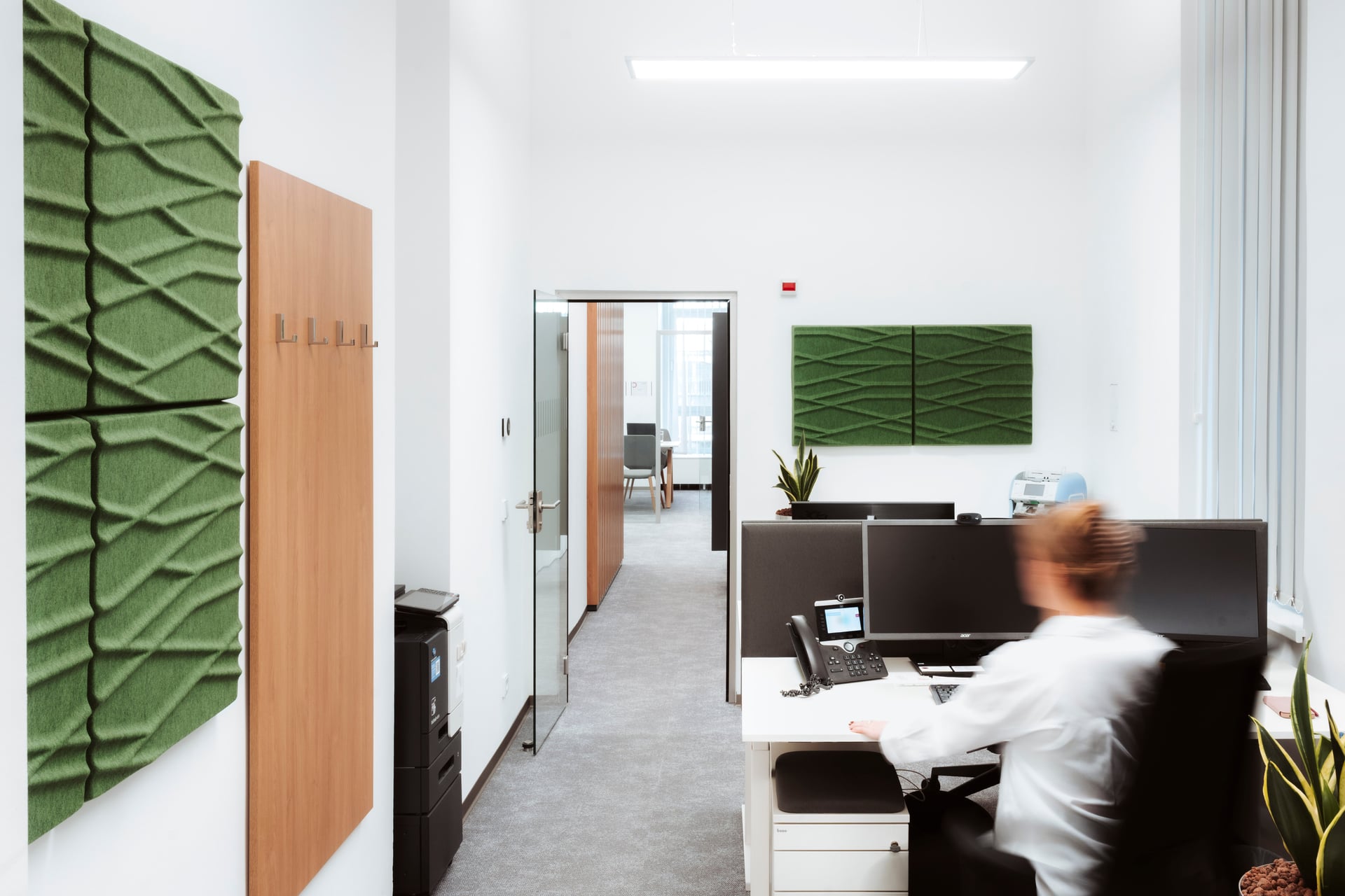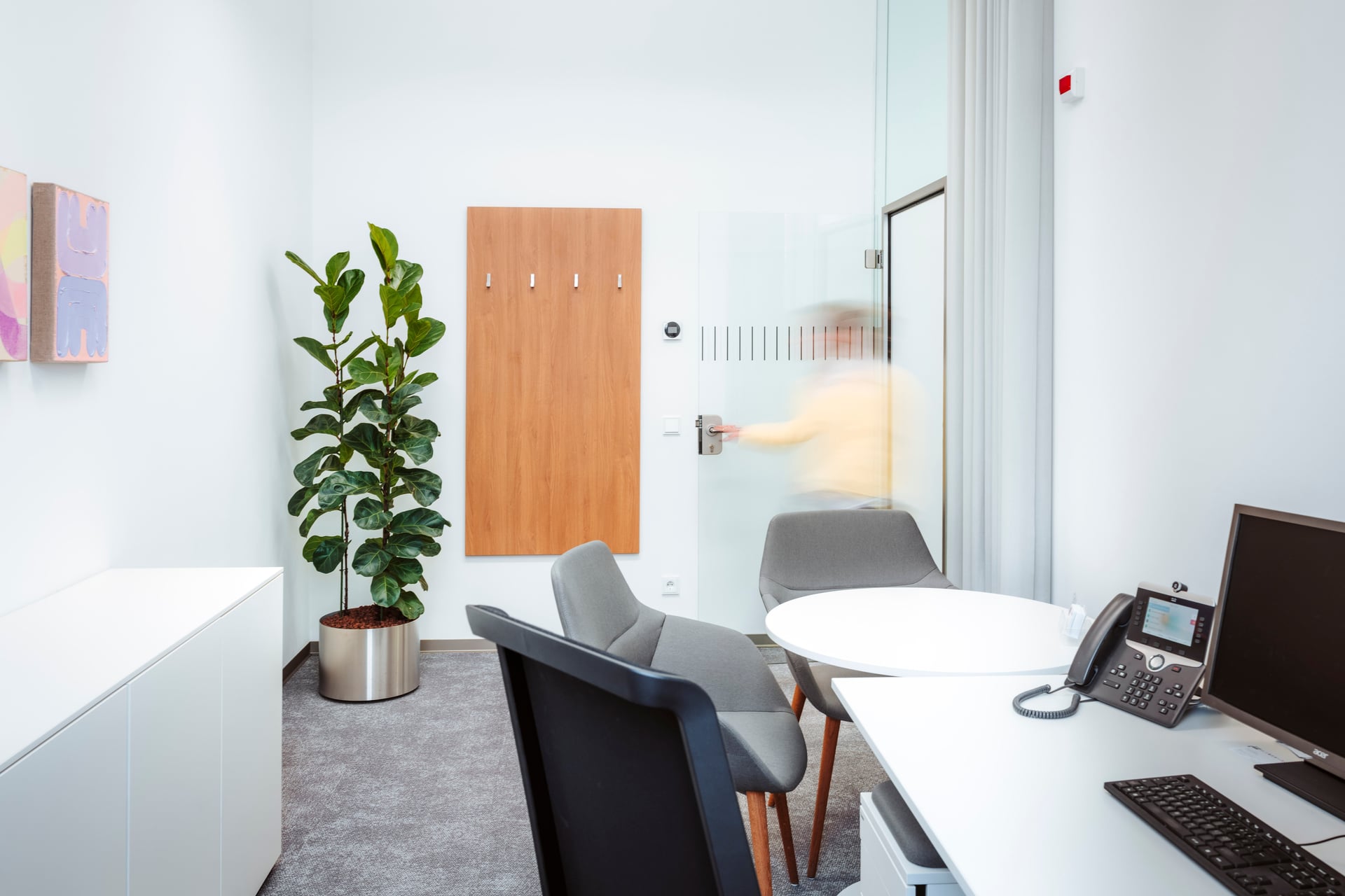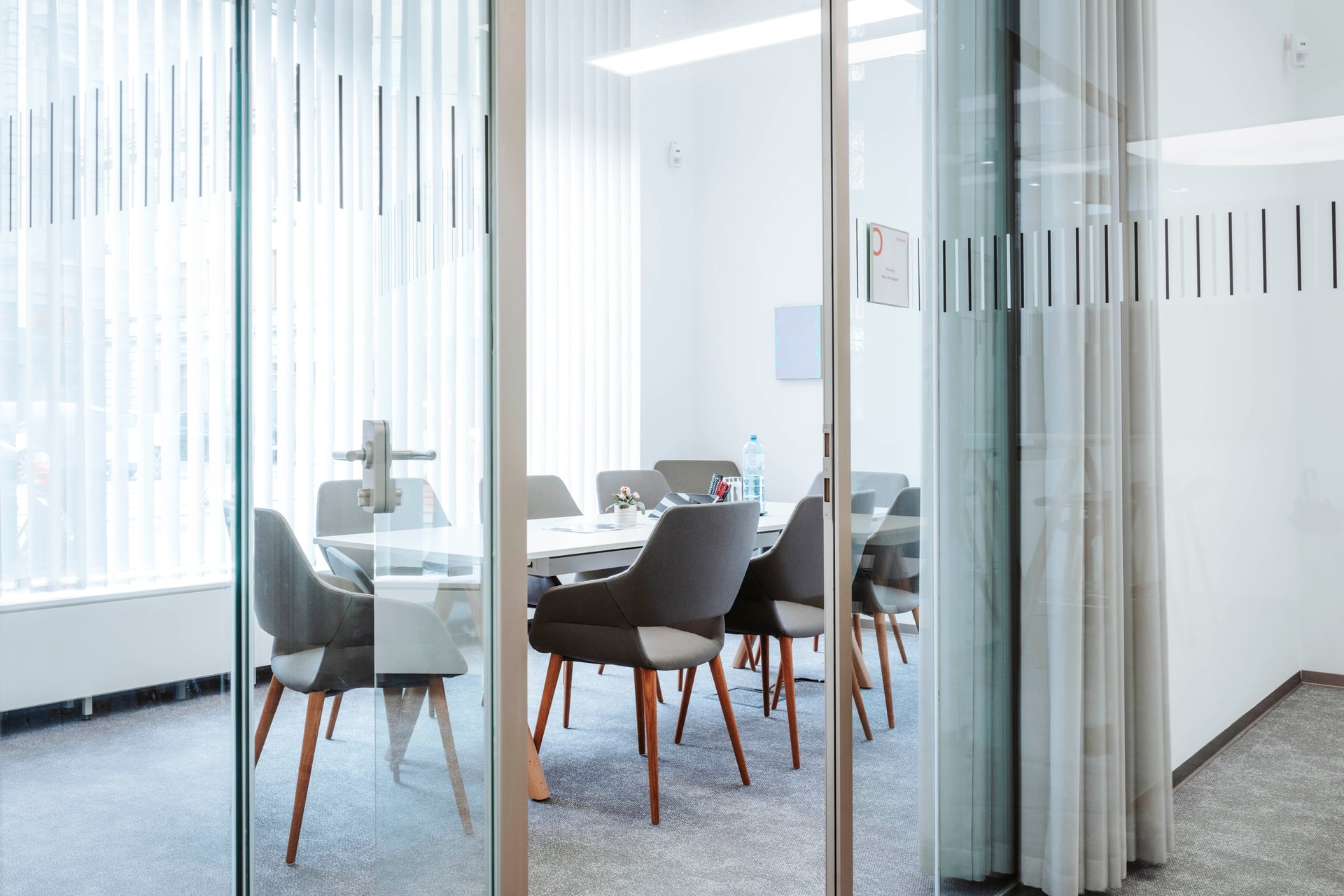 Das Raumkonzept setzt auf eine klare Struktur: Neben den klassischen Servicebereichen bietet eine Kommunikationszone Raum für kurze Gespräche, Wartebereiche oder kleine Veranstaltungen. Die neuen Beratungsräume sind mit großformatigen Bildschirmen ausgestattet. Vorhänge an den Glaswänden schaffen dabei eine wohnliche Atmosphäre und sorgen gleichzeitig für Schallschutz sowie die notwendige Diskretion in den Beratungsbereichen.