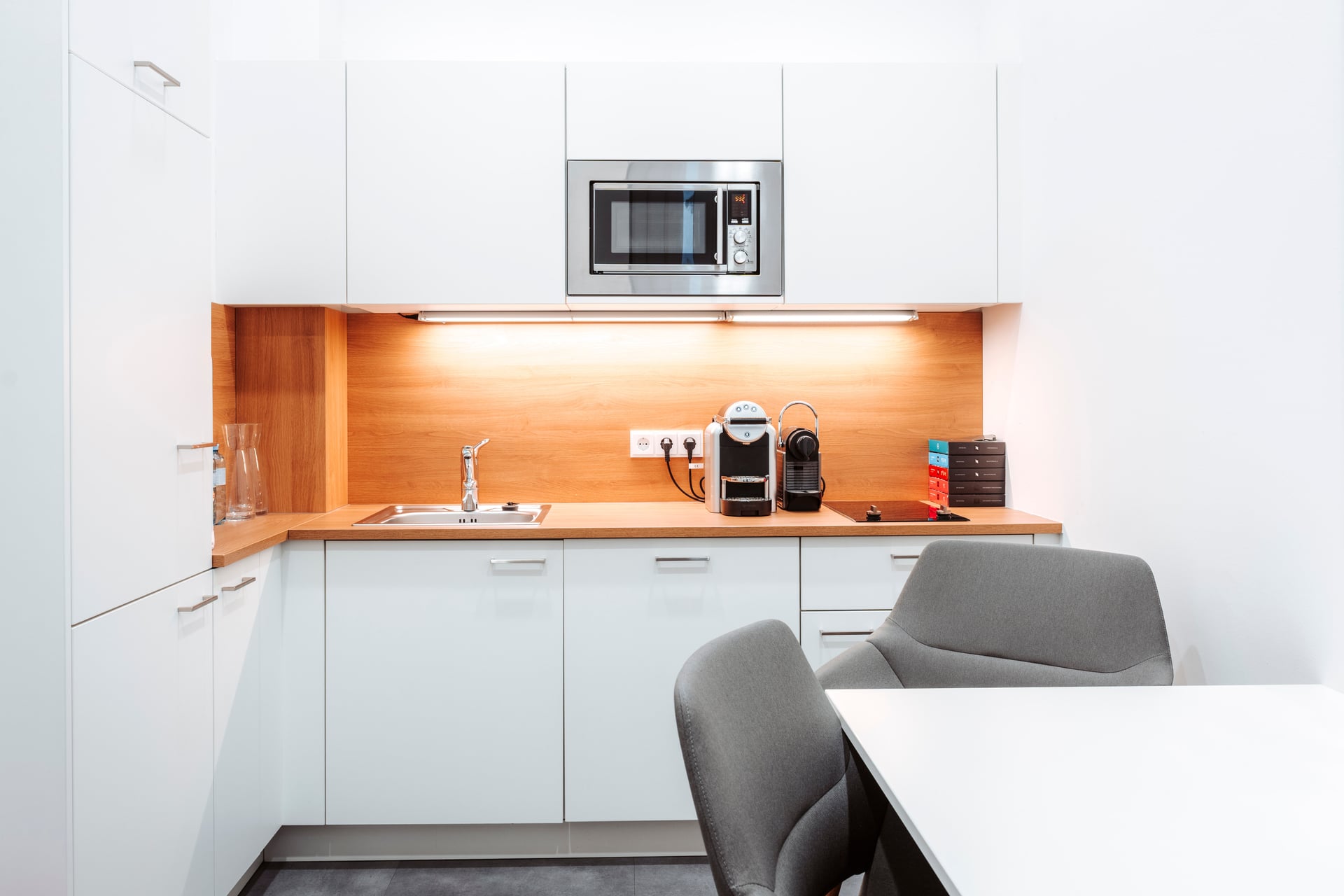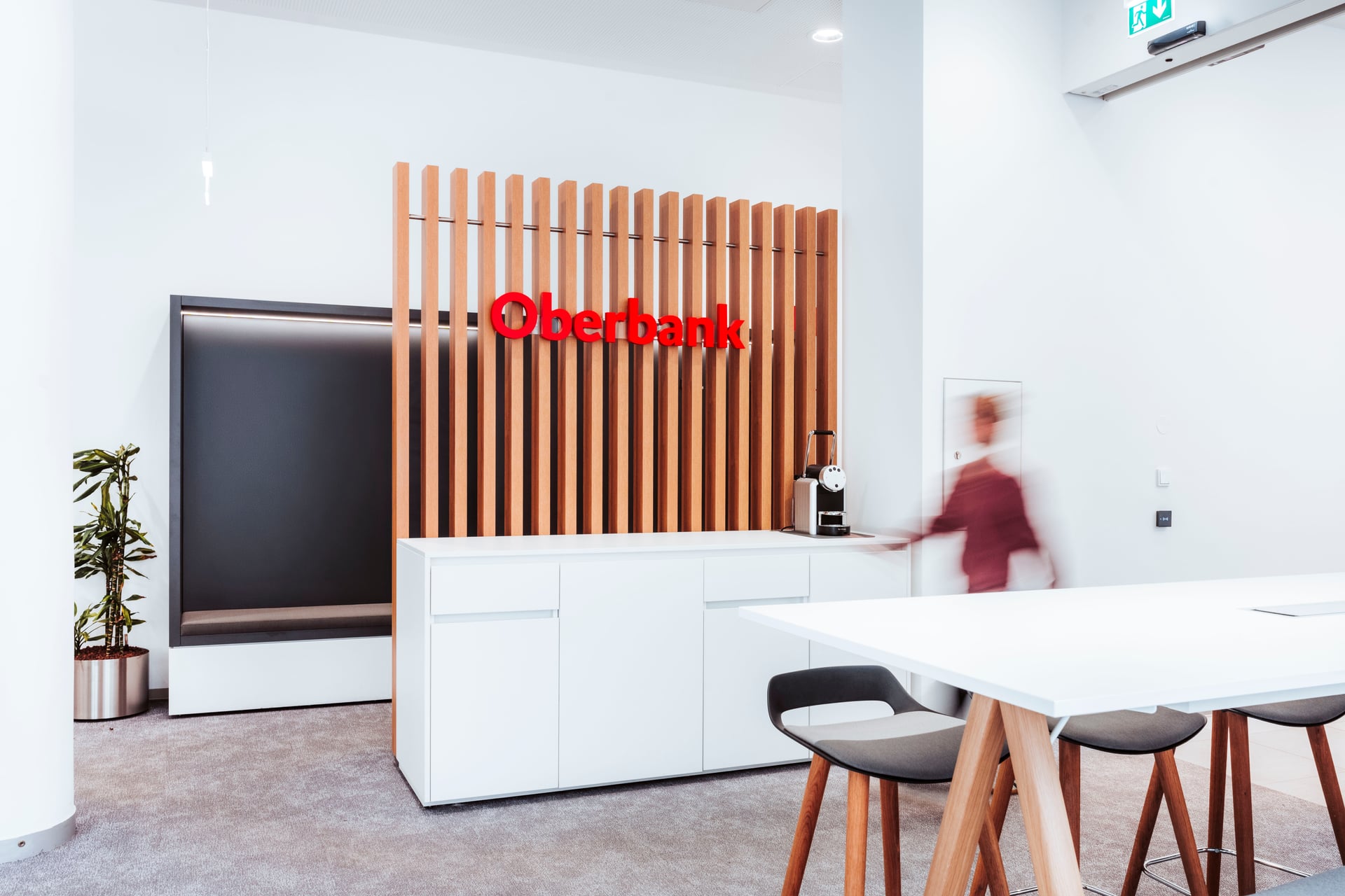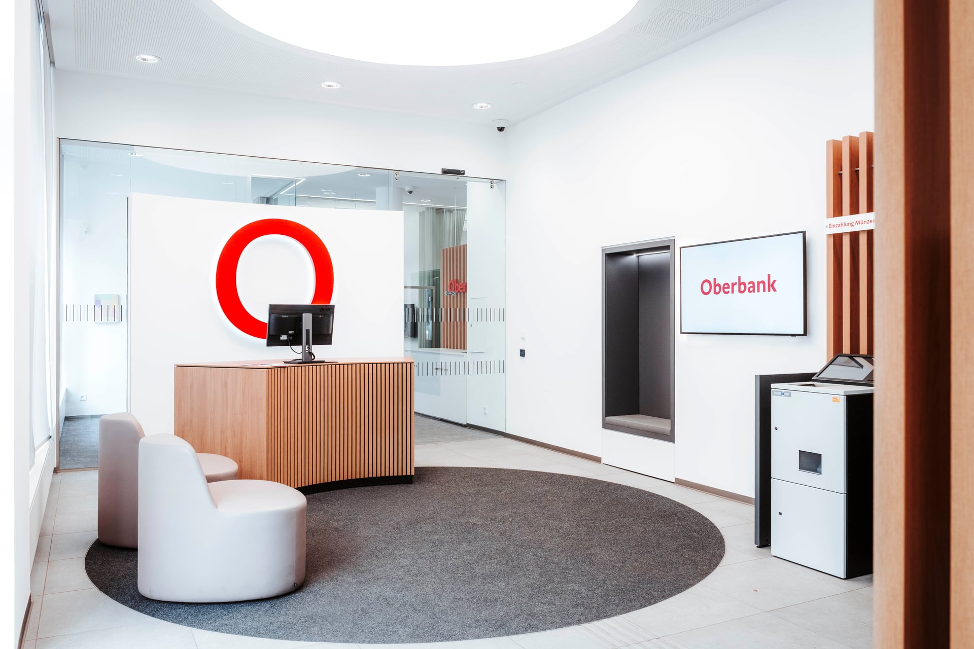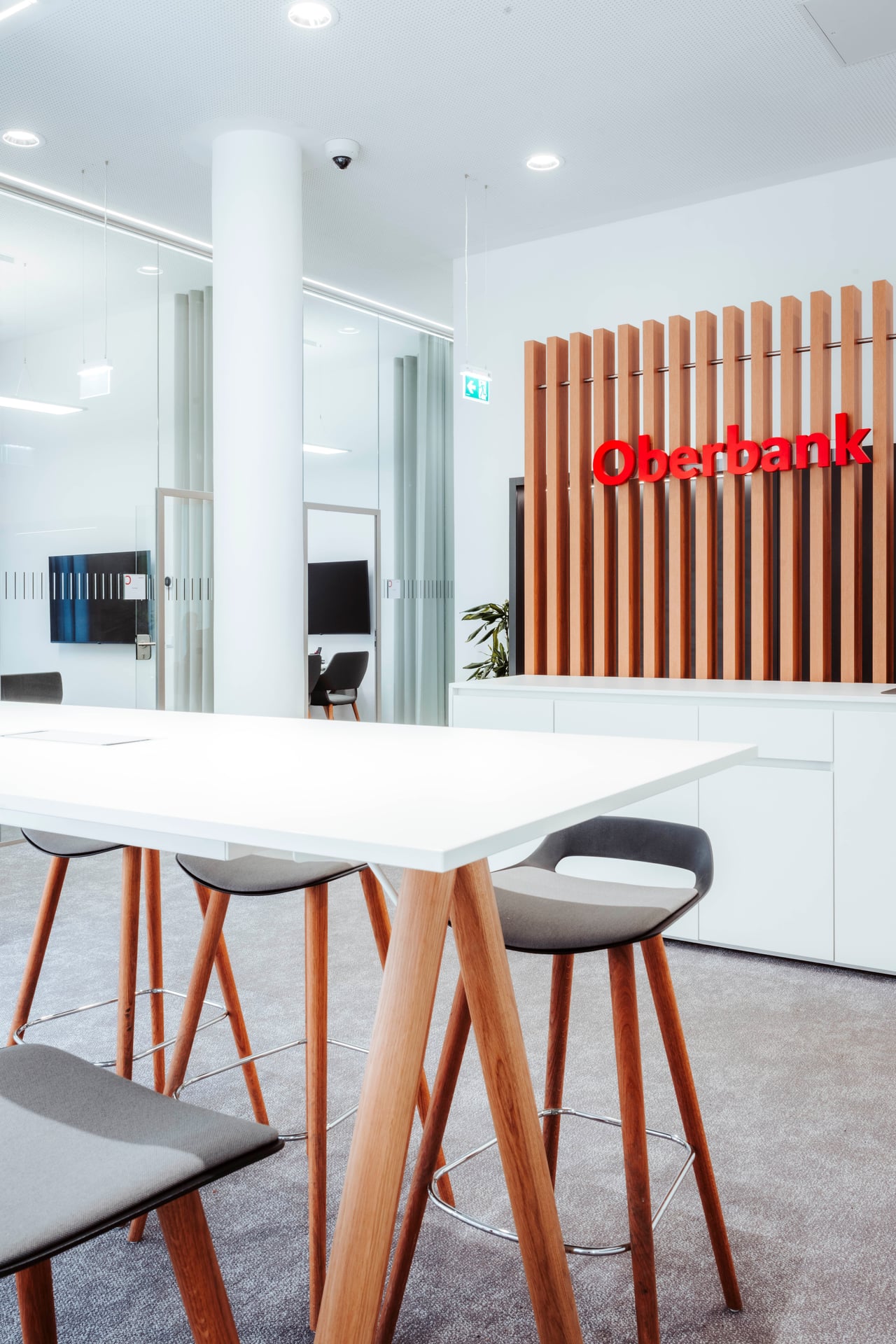 Ein besonderes Highlight des Projekts ist die Umsetzung der ersten Bankstelle des neuen Oberbank-Filialkonzeptes in Wien. Charakteristische Gestaltungselemente dieses Konzepts sind unter anderem eine prägnante Markenwand sowie eine Lichtdecke, die den Raum gleichmäßig ausleuchtet und eine moderne Atmosphäre schafft. Ergänzt wird das Konzept durch offene Kommunikationsbereiche und zeitgemäß gestaltete Beratungsräume, die eine angenehme und wohnliche Umgebung für Gespräche mit Kundinnen und Kunden bieten.