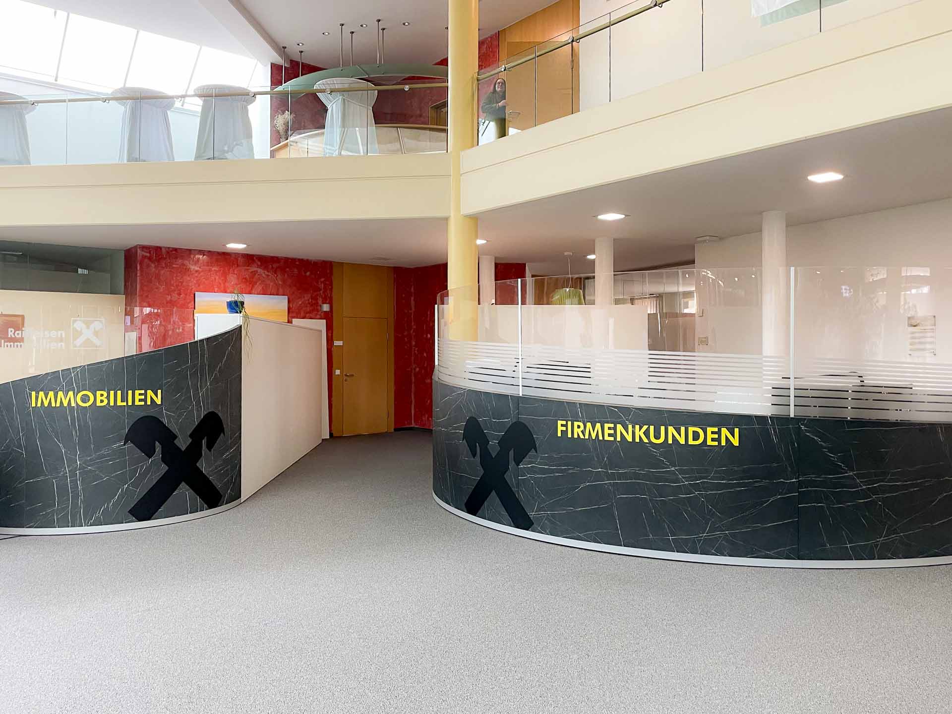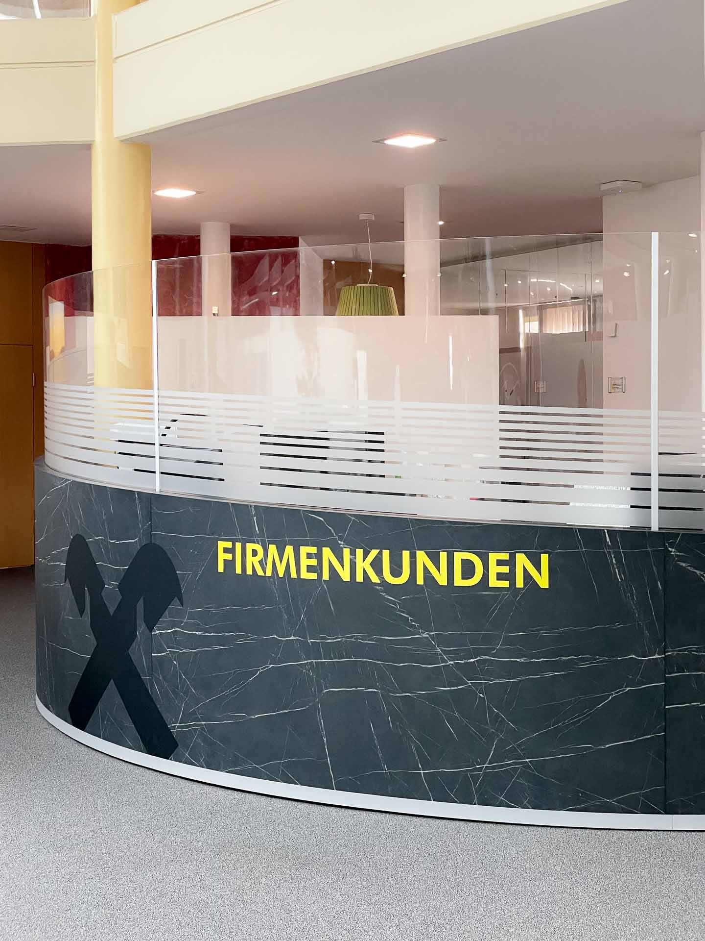 Auch der Bereich für Firmenkundinnen und -kunden wurde neu konzipiert und fügt sich harmonisch in das bestehende Gestaltungskonzept ein. Die Verbindung aus offenen und diskreten Zonen unterstützt unterschiedliche Anforderungen an Beratung und Service.