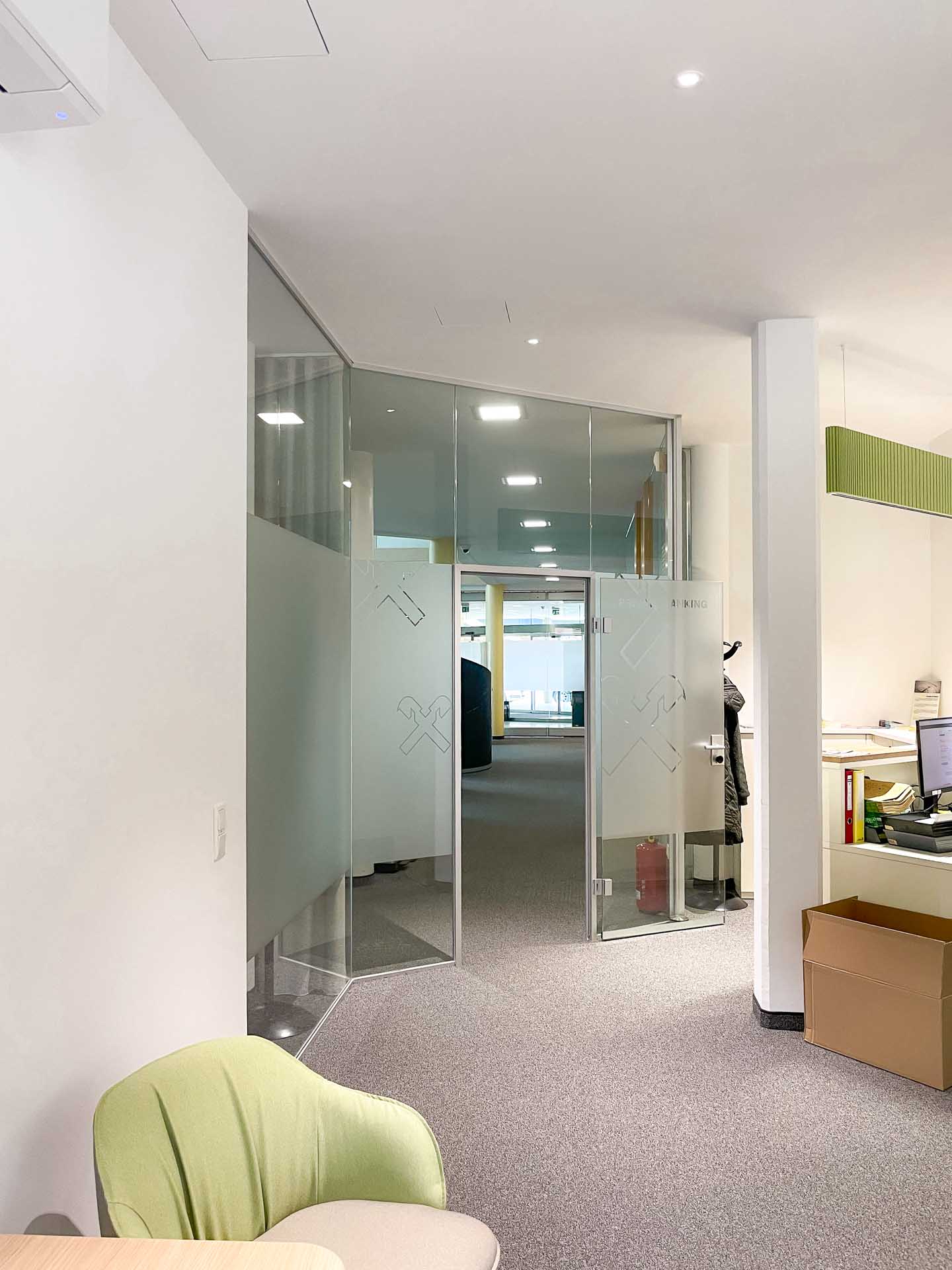 Die Umsetzung erfolgte in mehreren Bauphasen bei laufendem Bankbetrieb. Dies stellte besondere Anforderungen an Planung und Koordination, da sowohl der Baustellenbetrieb als auch der tägliche Kundenverkehr parallel organisiert werden mussten. Durch eine strukturierte Vorgehensweise konnte der Geschäftsbetrieb durchgehend aufrechterhalten und ein reibungsloser Ablauf sichergestellt werden.